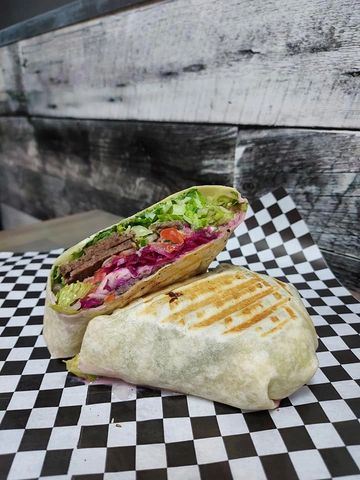Homemade Donair meat and sauce with onion, tomatoes, lettuce, Jack cheese and pickled Cabbage wrap (GF Option: Turkish Donaira Bowl, same toppings on rice)